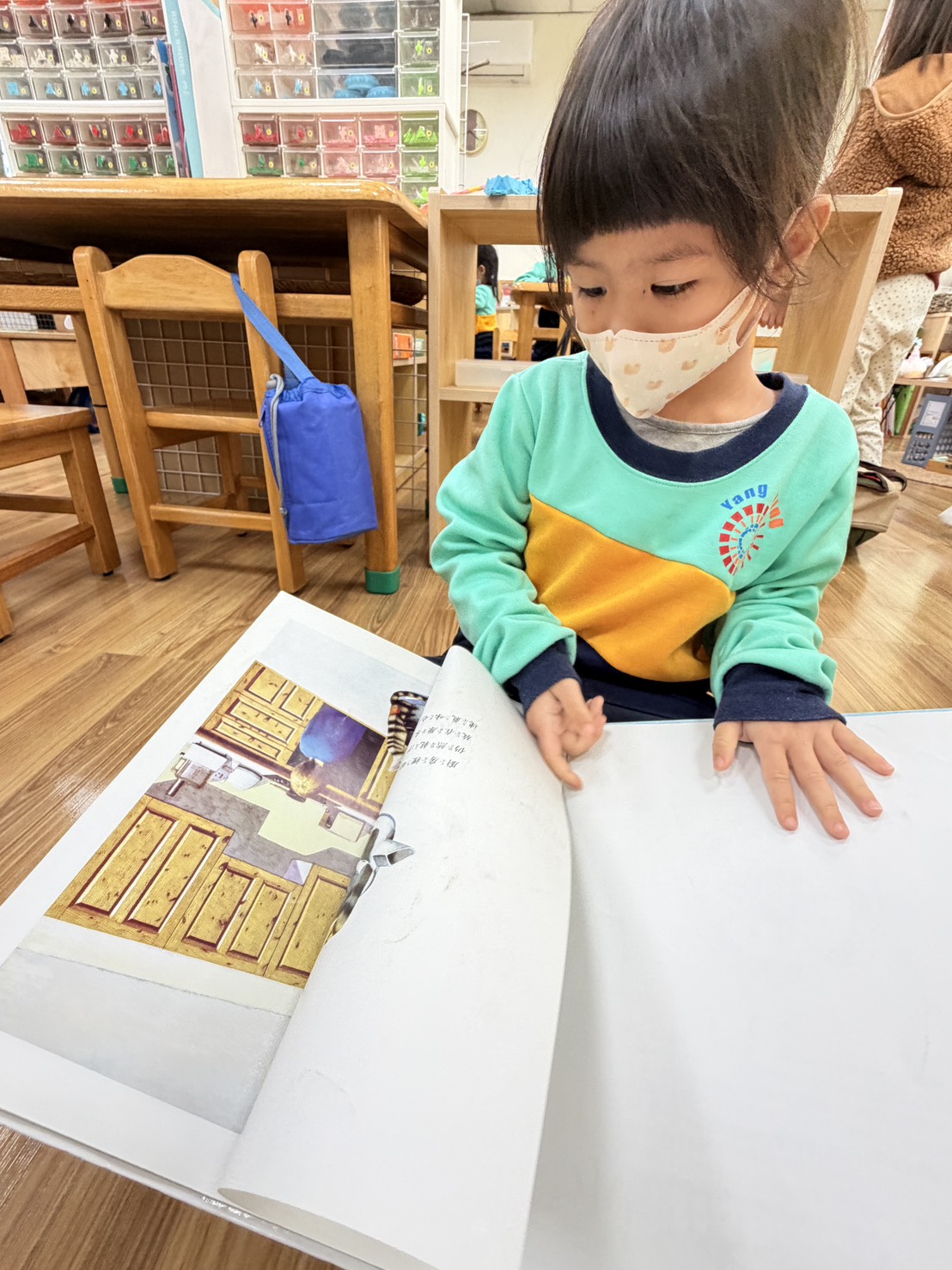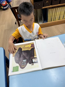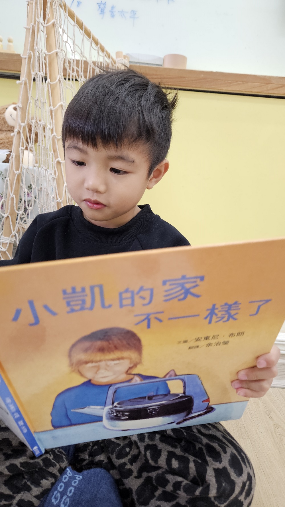 作者安東尼.布朗透過他最擅長的超現實變形的技法,描述主角小凱家中將多一位新生兒,因不知道爸爸所說的「不一樣」所指為何,心中產生的忐忑不安及猜疑。作者營造許多想像空間,閱讀時不管大小讀者都會被其插畫諸多圖像的幻變細節吸引。共讀時引導孩子細心觀察每頁插圖的意涵,感受主角小凱心情的起伏,從恐懼不安,到故事結局新生兒出現時的釋然和溫馨感。安東尼.布朗的插畫特色慣用變形的技法刻畫主角的內在情緒或鋪陳故事情節,相關類似技法的書還有《朱家故事》、《當乃平遇上乃萍》、《威利的畫》…等,可引導幼兒閱讀賞析相關的群書,發現該作者的獨特風格。