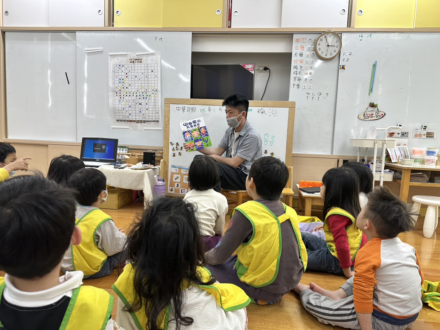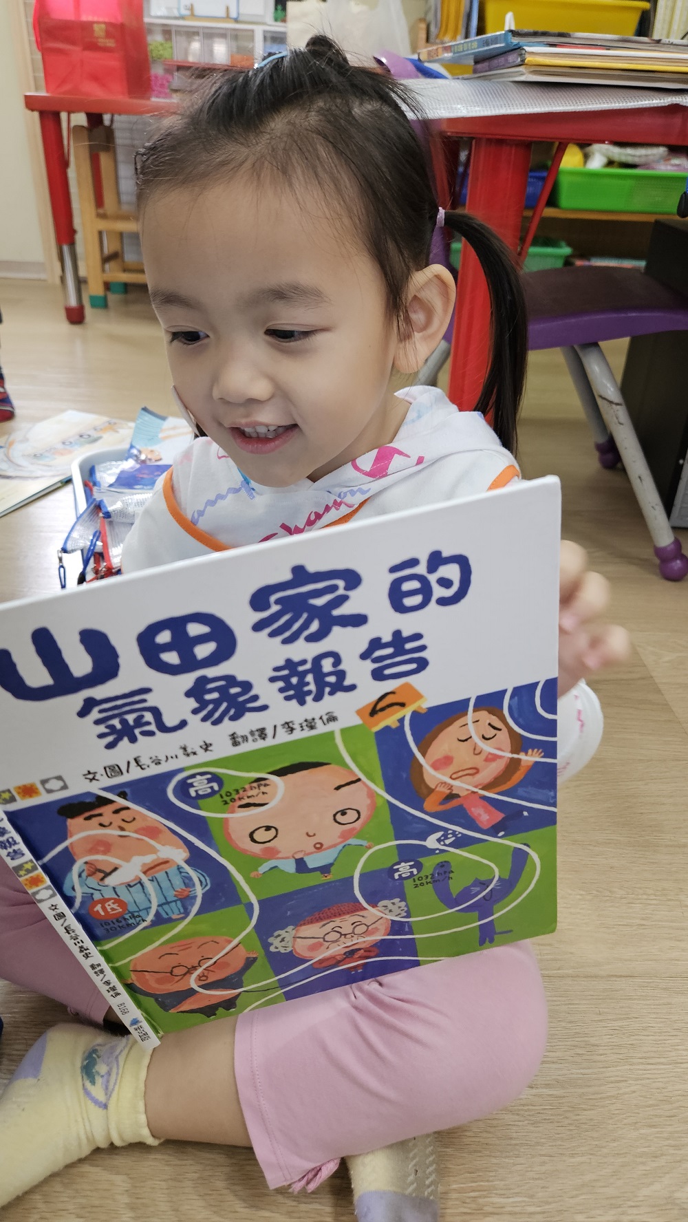 將山田家一天發生的事情與天氣作結合,一方面讓幼兒能了解基本的氣象概念,透過語詞雙關的方式,在親子閱讀時,能讓幼兒覺察到語詞當中更深層的寓意而帶出情緒上的感受,故事分兩條線進行,開始和最後又合而為一,可讓幼兒敘說一條故事線發生的事。
