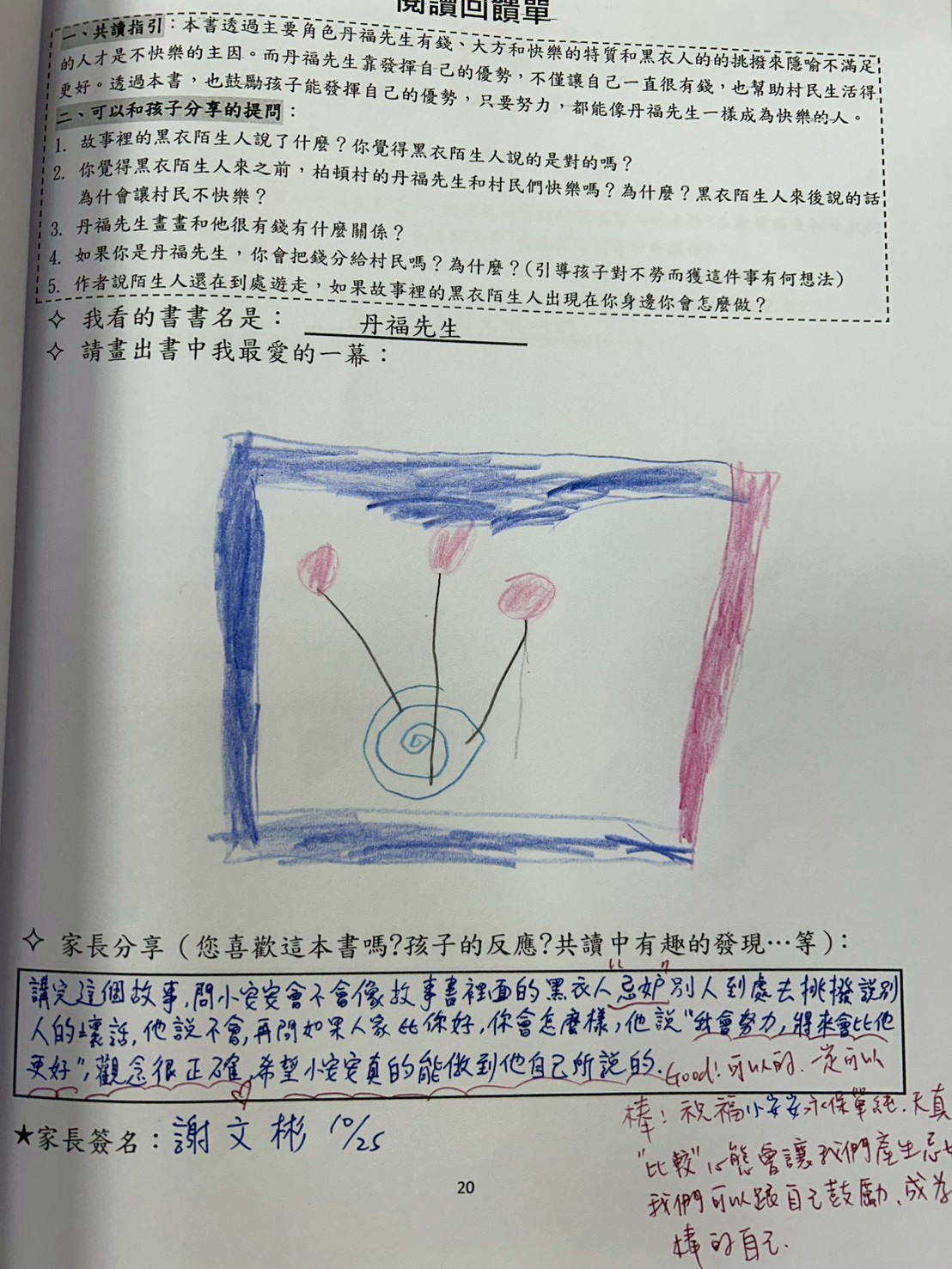 本書透過主要角色丹福先生有錢、大方和快樂的特質和黑衣人的的挑撥來隱喻不滿足的人才是不快樂的主因。而丹福先生靠發揮自己的優勢,不僅讓自己一直很有錢,也幫助村民生活得更好。大衛˙麥基的作品隱喻味道濃厚,但又不流於教條式的說教,擅長以幽默方式在故事中營造思考空間。透過本書,也鼓勵孩子能發揮自己的優勢,只要努力,都能像丹福先生一樣成為快樂的人。