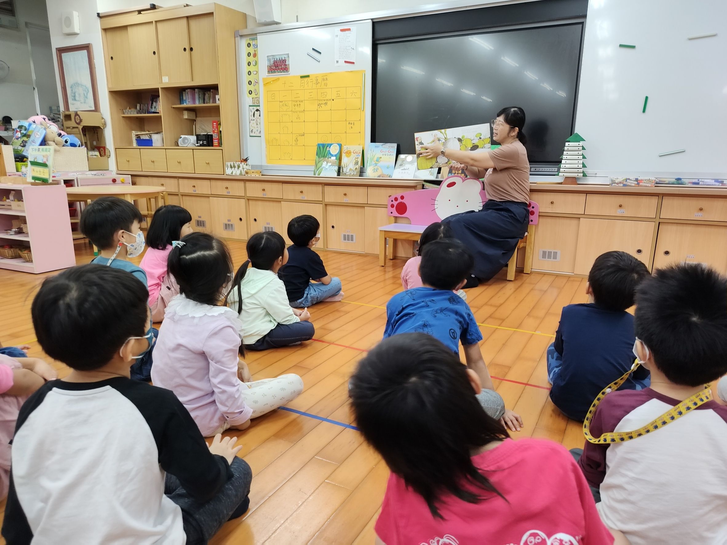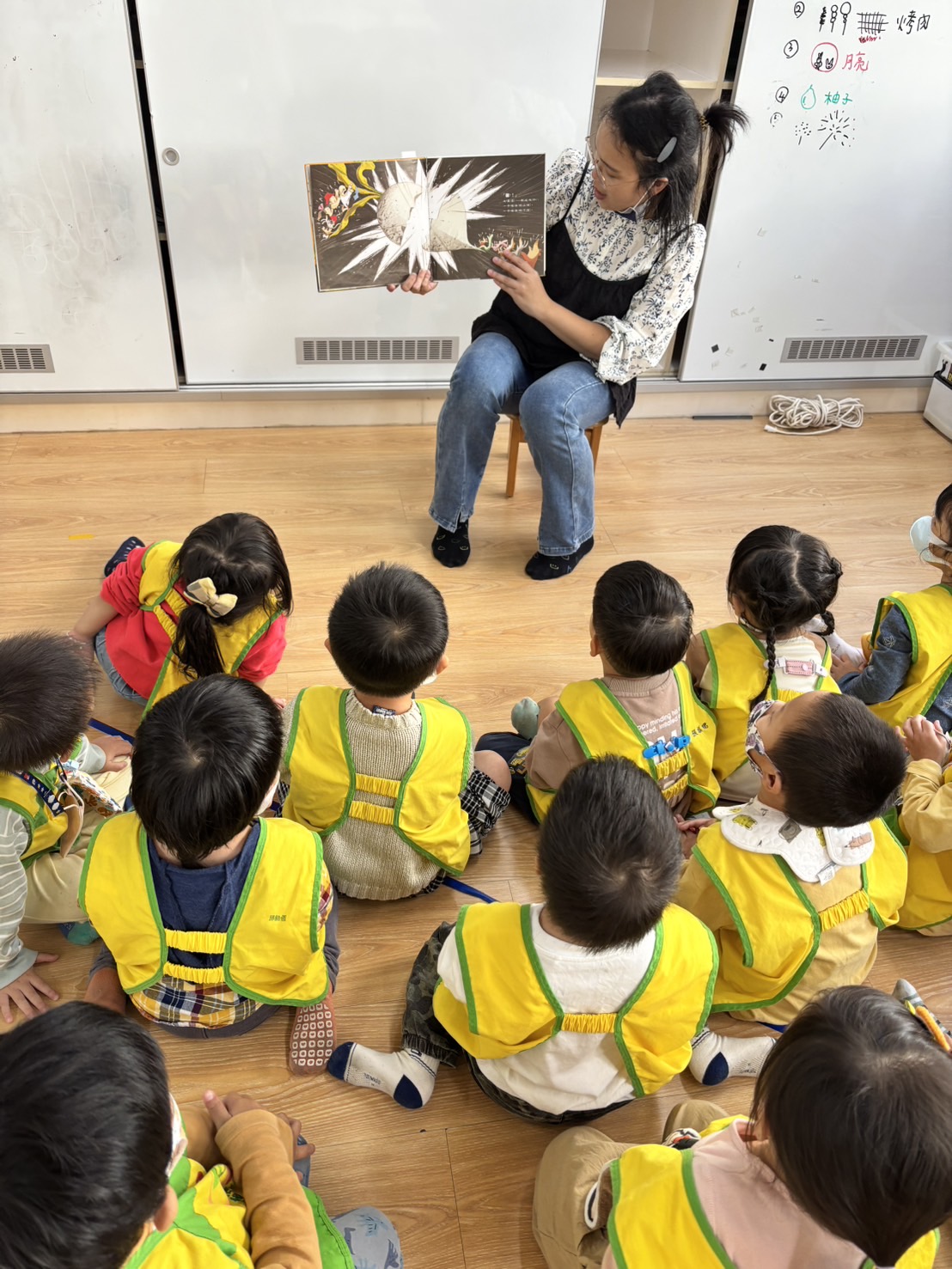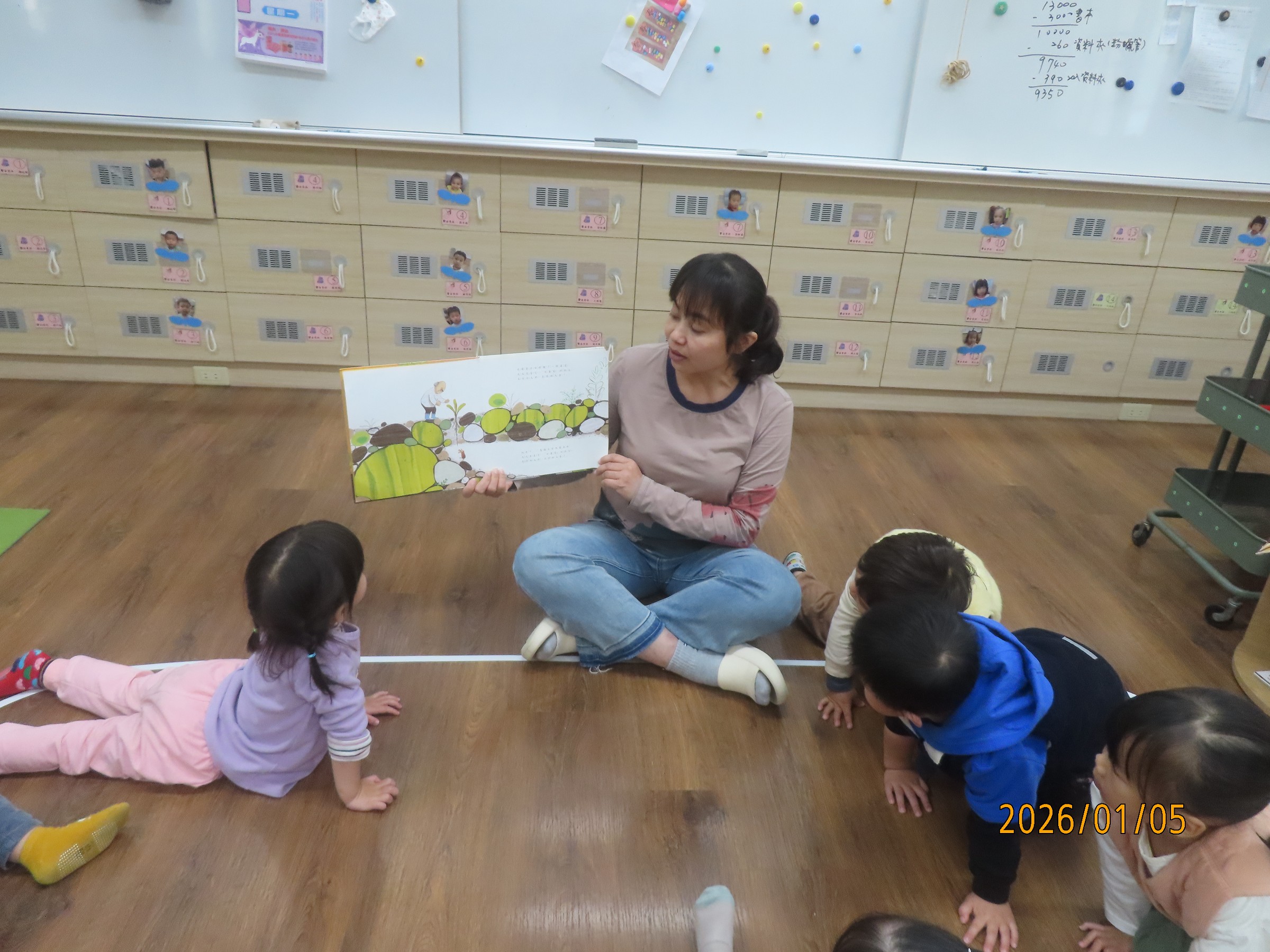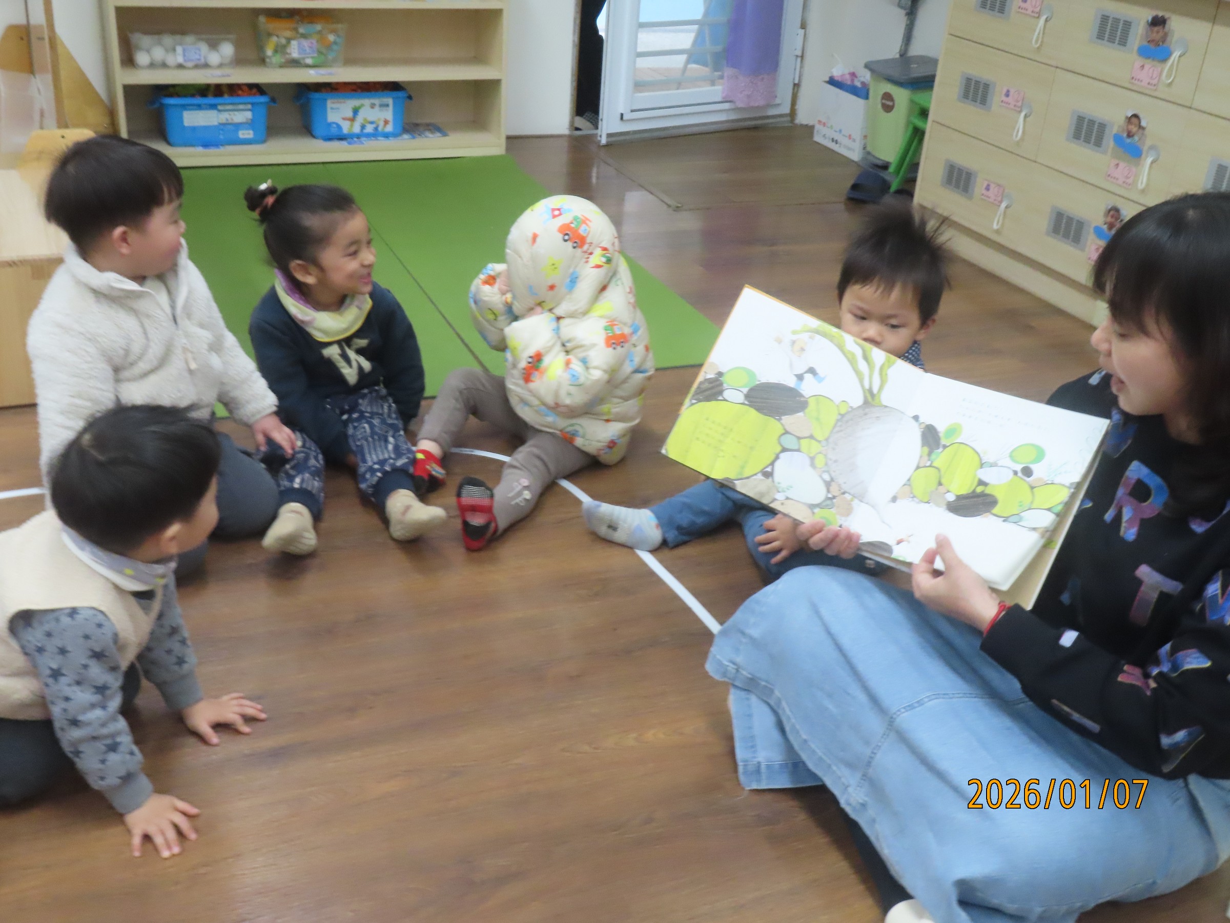 家長可與幼兒輪流唸出第一及第二頁的重複語句,並引導幼兒觀察畫面的角色,「蘿蔔長出來了……,○○○看到嚇一跳!」透過故事中另一個重頭戲的重複語句-「嘿喲!嘿喲!拔不動。○○○、○○○快快來」,引導幼兒觀察下一個拔蘿蔔的角色順序是誰,幼兒找出一個個堆疊角色後,可預測拔蘿蔔的故事發展並唸出拔蘿蔔時有趣的重複語句。
