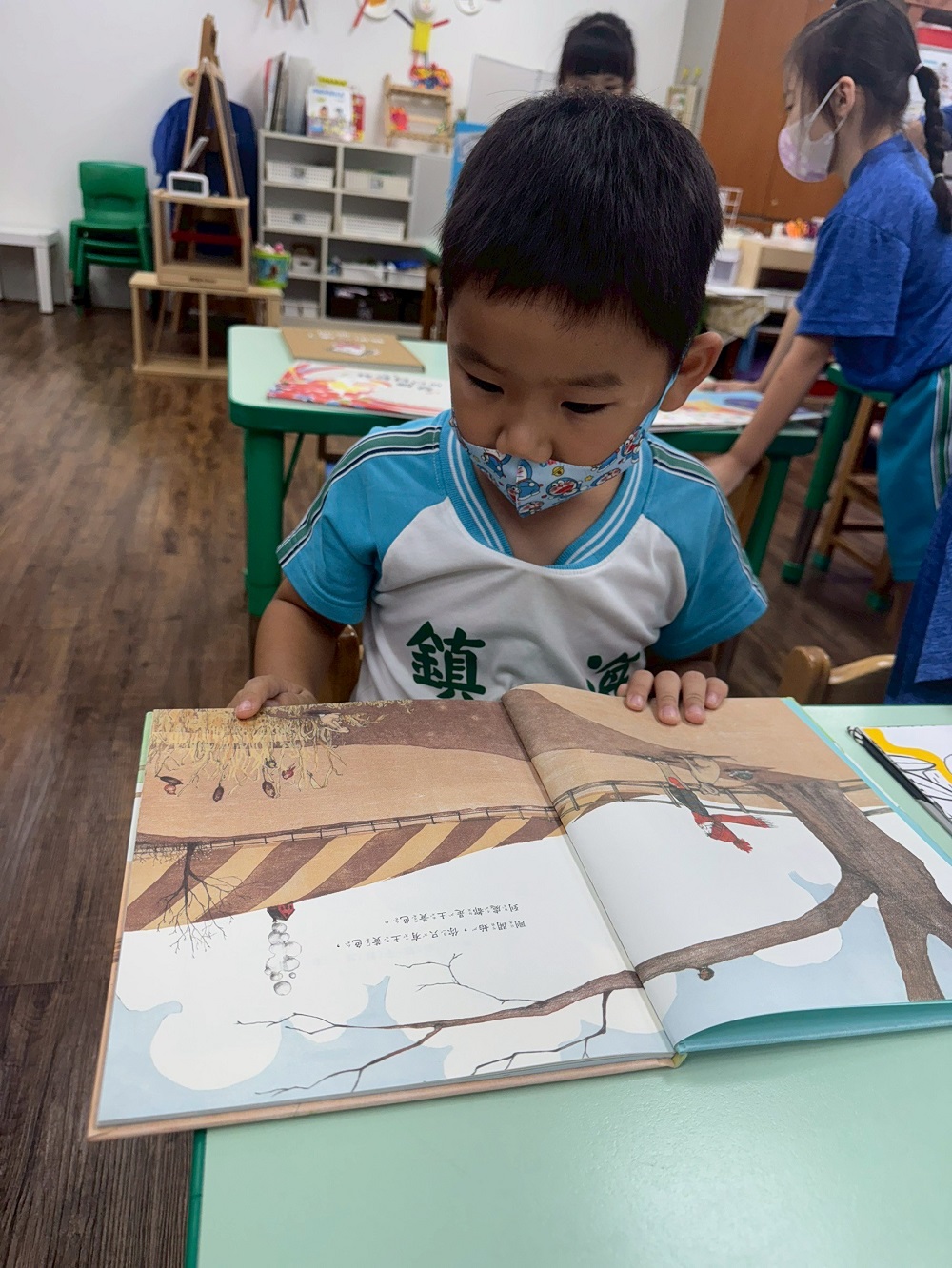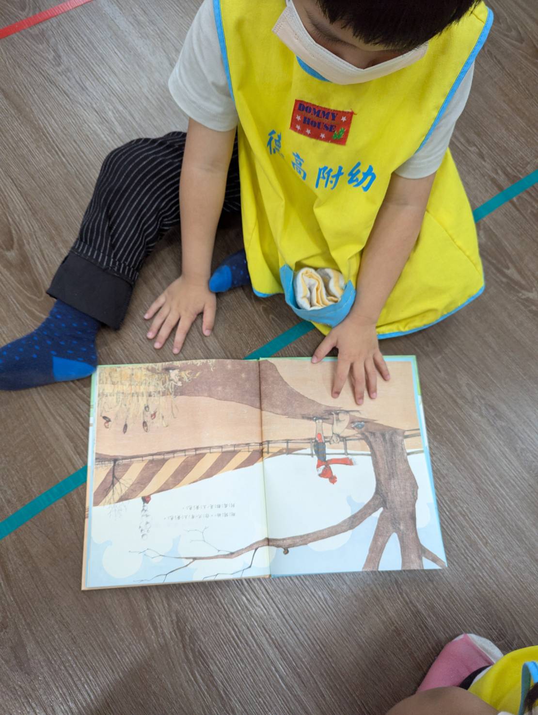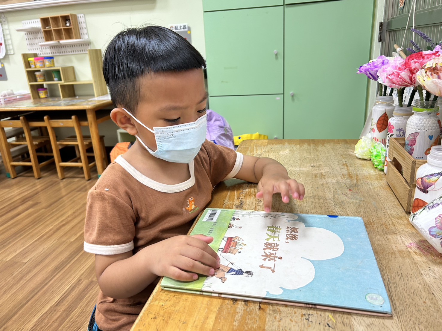 這是關於男孩在冬、春二個季節交替時,與一片大地之間所發生的故事。引導孩子觀察從最前面書名頁中男孩自家門出發的(冬天)穿著,到最後一頁版權頁裡男孩短袖短褲的變化,去感受季節轉變所帶來的溫度。再藉由文本主要的兩種色調:天藍色(天空、男孩衣著…)、土黃色(大地、狗、兔子、熊、鳥…),直到最後一頁全版加入綠地的場景,突顯出春天「綠意盎然」的生命力。其淡淡的筆觸,使用大自然柔和的色調,使讀者感受土地孕育生命過程中,這種淡淡氛圍的幸福感,就像男孩靜靜地呵護著種子生長的同時,有他的忠實動物朋友(烏龜、狗)相伴。文本簡短的字句,溫和地表達男孩的心境,等待、再期待,逐漸引導讀者成為第一人稱的角度敘說故事,最終甚至引導讀者說出文本中沒有出現過的「然後,春天就來了。」的書名!可引導孩子留意本作品使用的顏色,亦可延伸閱讀及比較作者/繪者另一部作品《如果你想看鯨魚》創作風格的異同。